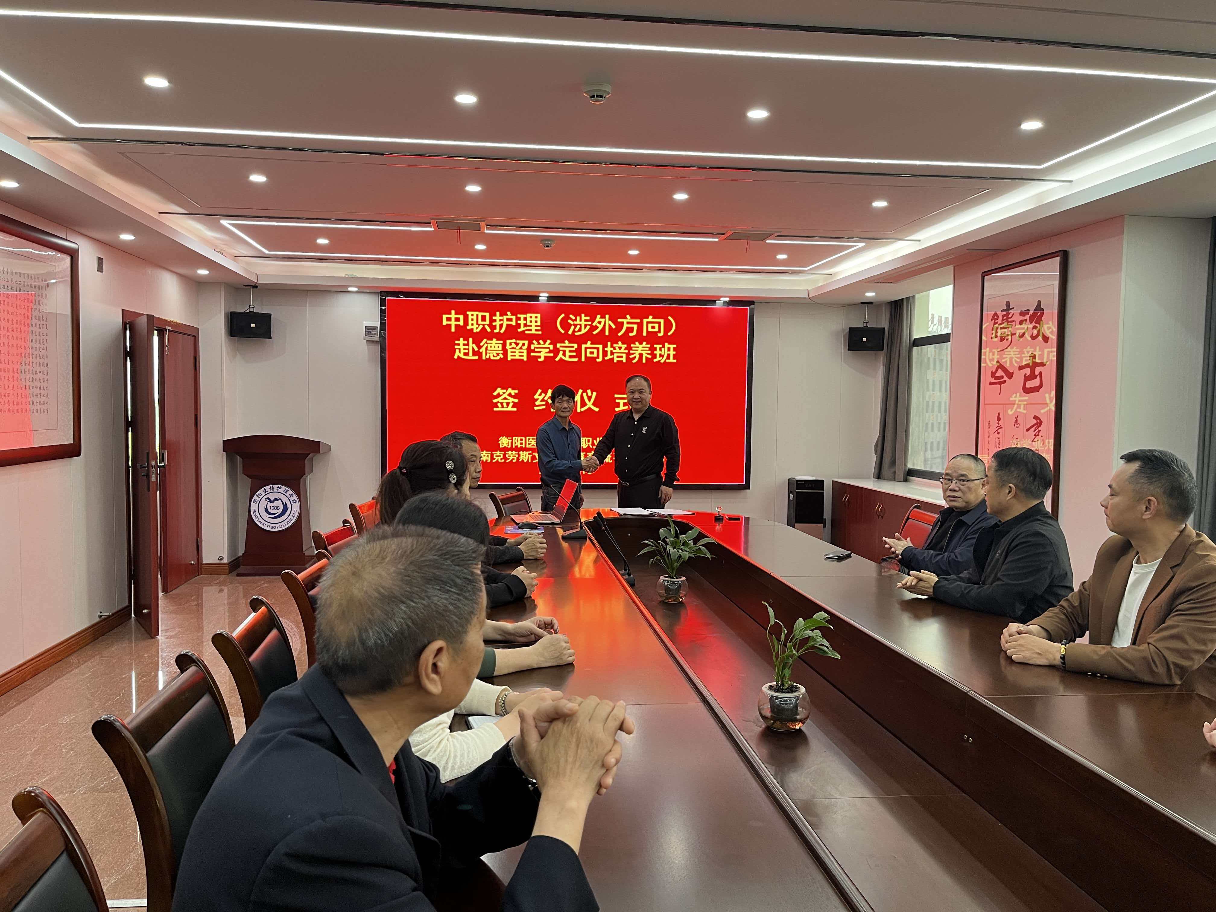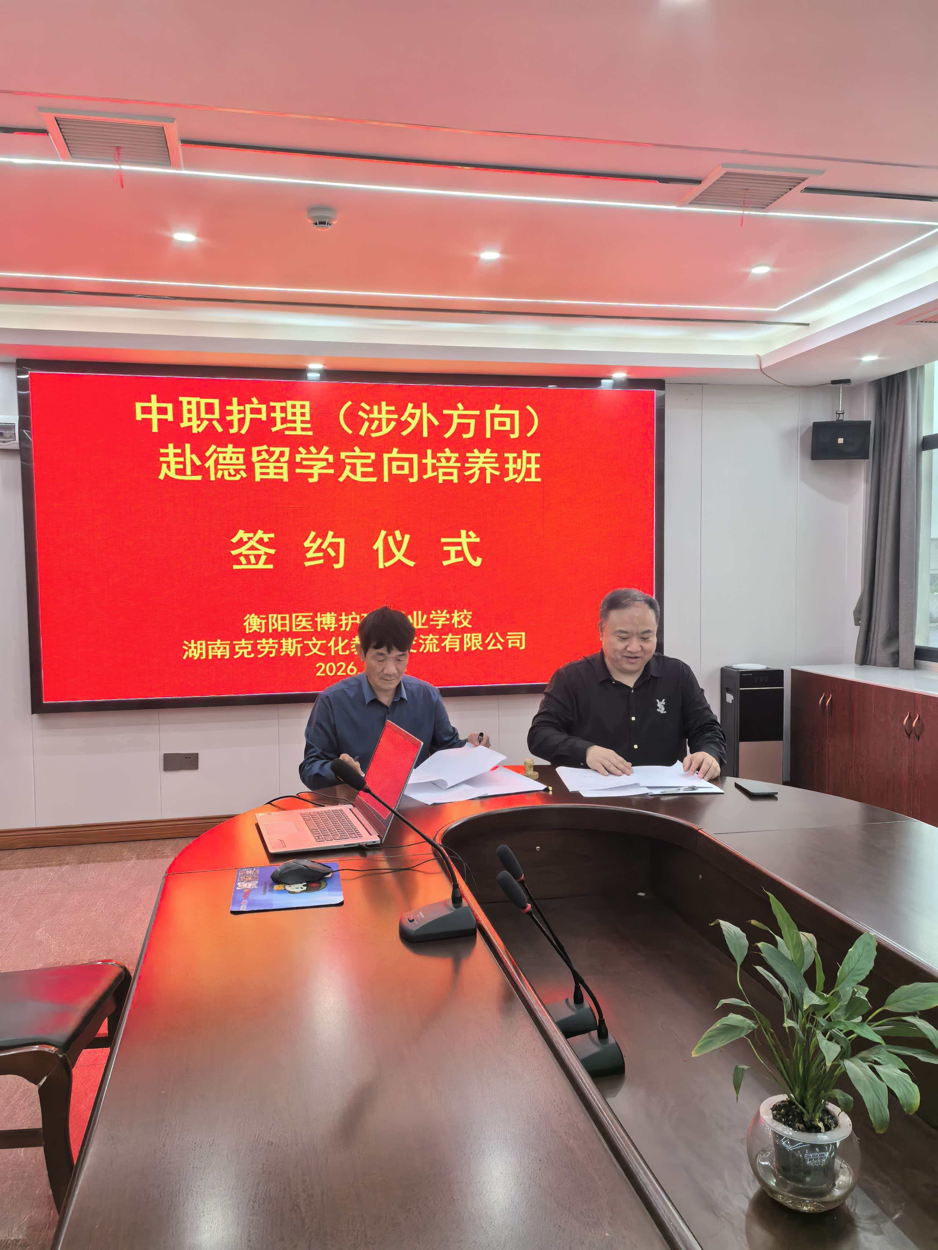 2026年4月13日,湖南克劳斯文化教育交流有限公司与衡阳医博护理职业学校于衡阳学校内隆重举行 “赴德留学定向培养班”签约仪式。此次签约标志着在湖南克劳斯助力下,衡阳医博在培养具有国际视野的高端护理人才方面迈出了实质性的一步。