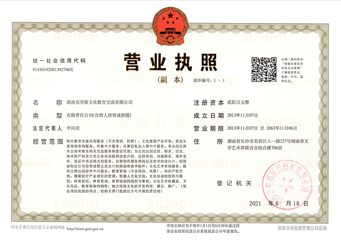湖南克劳斯文化教育交流有限公司是2013年经湖南省长沙市工商行政主管部门批准注册的,专业从事海外教育交流咨询服务;国际文化教育交流与咨询;因公(私)出入境、商务考察及相关交流服务和签证代理业务;自费出国留学服务;游学及文化旅游产业开发的合法企业,注册资本200万人民币。